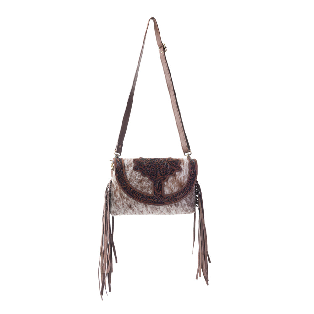 Where ranch meets romance, this stunning crossbody features authentic hair-on hide and hand-tooled leather detailing worthy of a master saddlemaker. Dancing leather fringe and vintage-inspired tooling capture the spirit of the wild Southwest, while brass hardware adds just the right touch of desert glamour. The back is a gorgeous chocolate brown leather. Top flap with zipper-close compartments, with detachable, adjustable shoulder strap in matching leather.