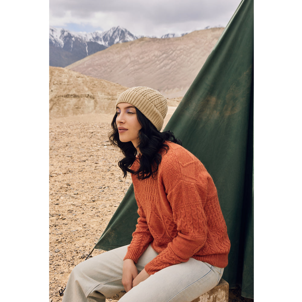 This dark orange-red coloured sweater will look best when paired with light coloured trousers and multicoloured scarf or muffler to go with it!