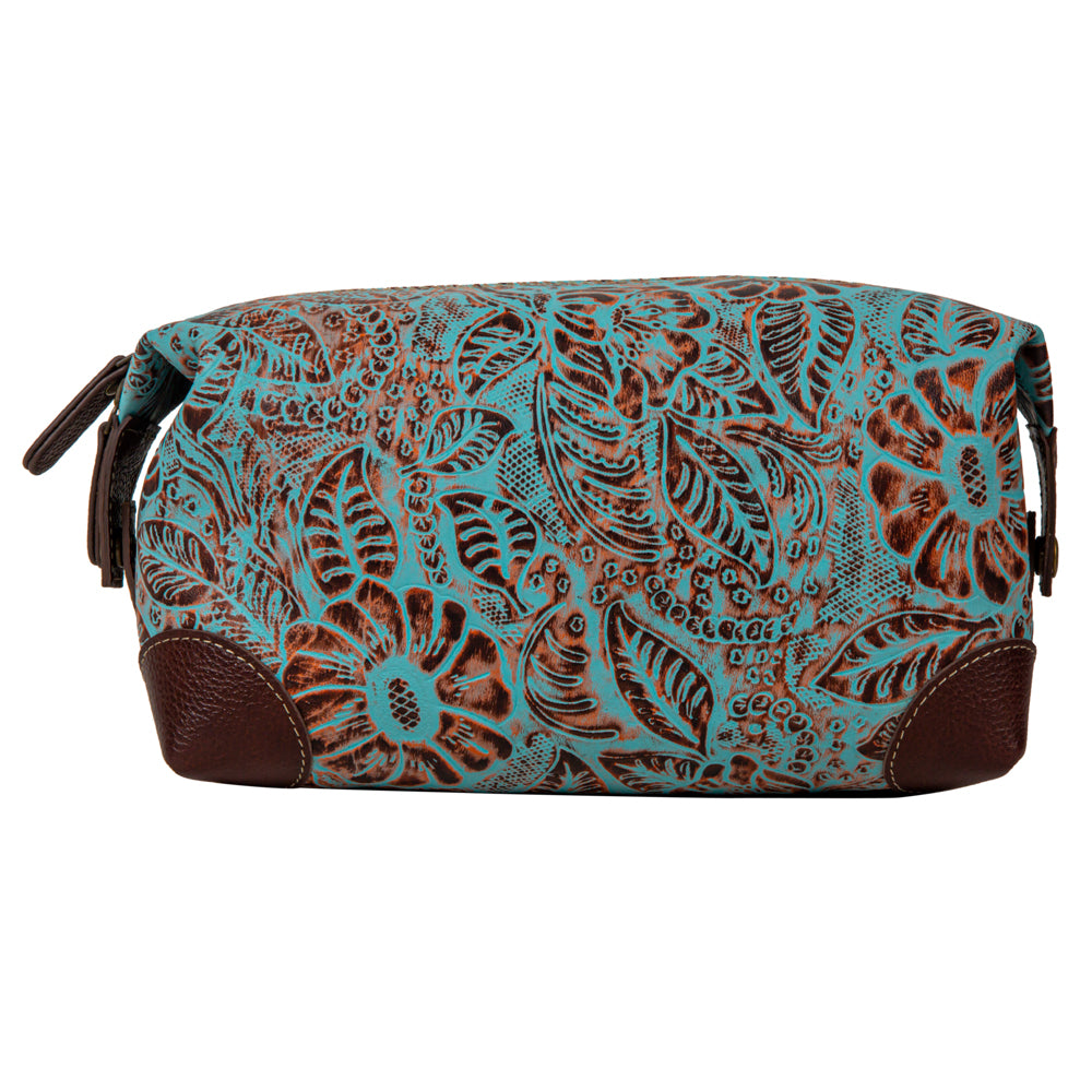 This beautiful toiletries bag features turquoise hand-tooled leather with corner leather accents. The roomy interior will hold your items securely with the zipper-close top. A beautiful and stylish accessory!