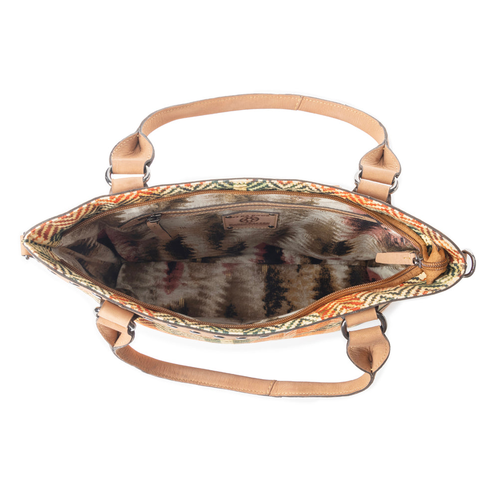 Embrace great sstyle with our vibrant chevron-patterned tote in warm hues of orange, green, and cream. Studded tan leather trim and reinforced corners add rustic charm and durability. Carrying handles and accent trim are in matching leather. The roomy interior makes this bag perfect for everyday adventures with bohemian flair.