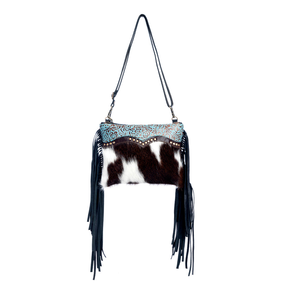 This incredible bag offers incredible style and great form! Tones of turquoise blue and brown adorn the beautiful stamped leather top panel; antiqued metal brads complete the look. Beautiful hair-on hide is featured on the front, with matching leather fringe on each side. The back is ebony leather with a zippered pocket. The detachable, adjustable shoulder strap is in matching leather. A sophisticated and alluring bag for any occasion.